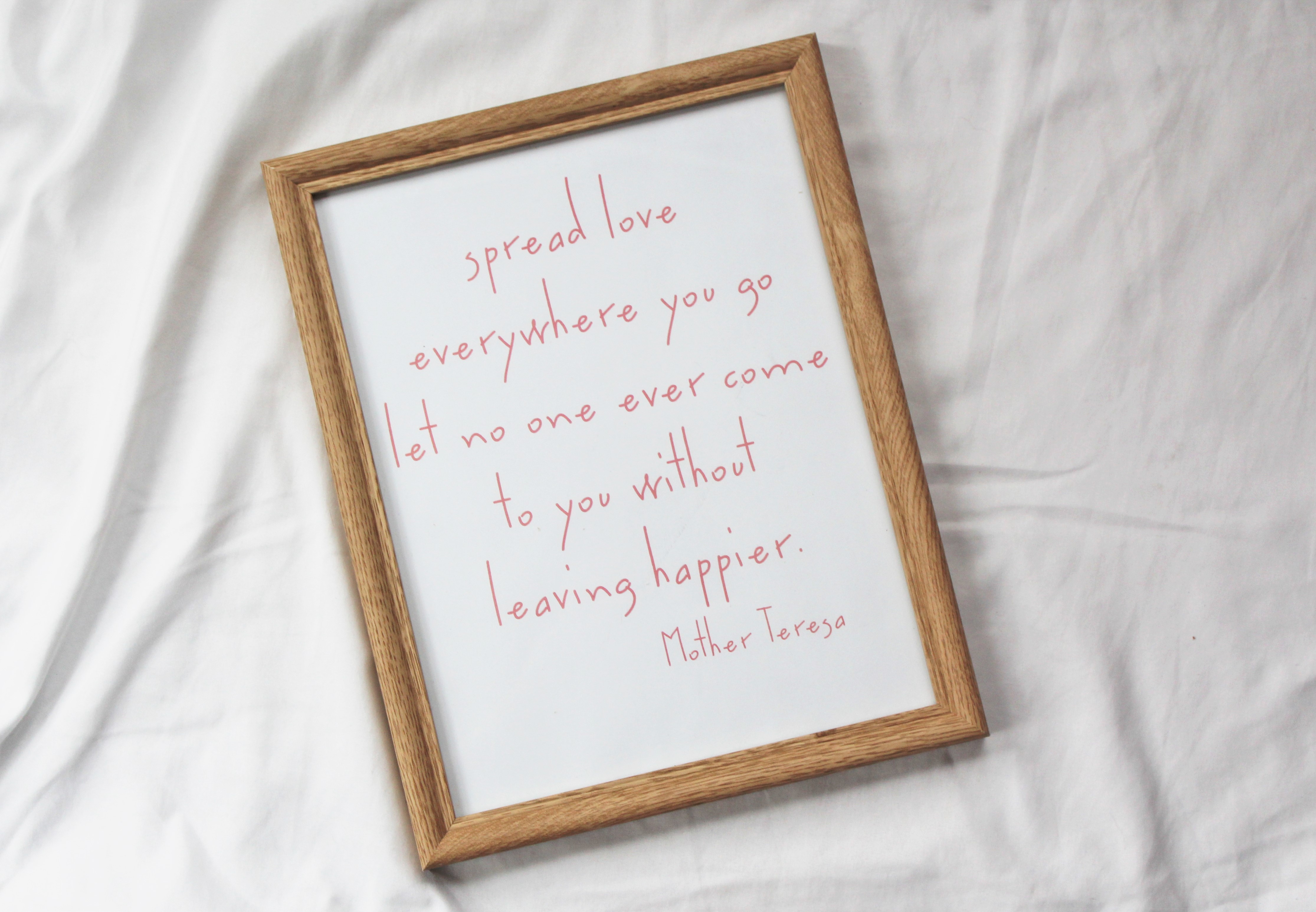 And (of course, ya saw it comin’) I designed some cute little printables with Mother Teresa quotes on them. They’re a gorgeous neutral light pink, so they’ll match pretty much everywhere.