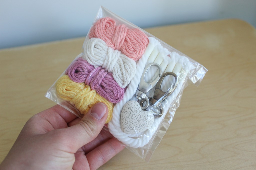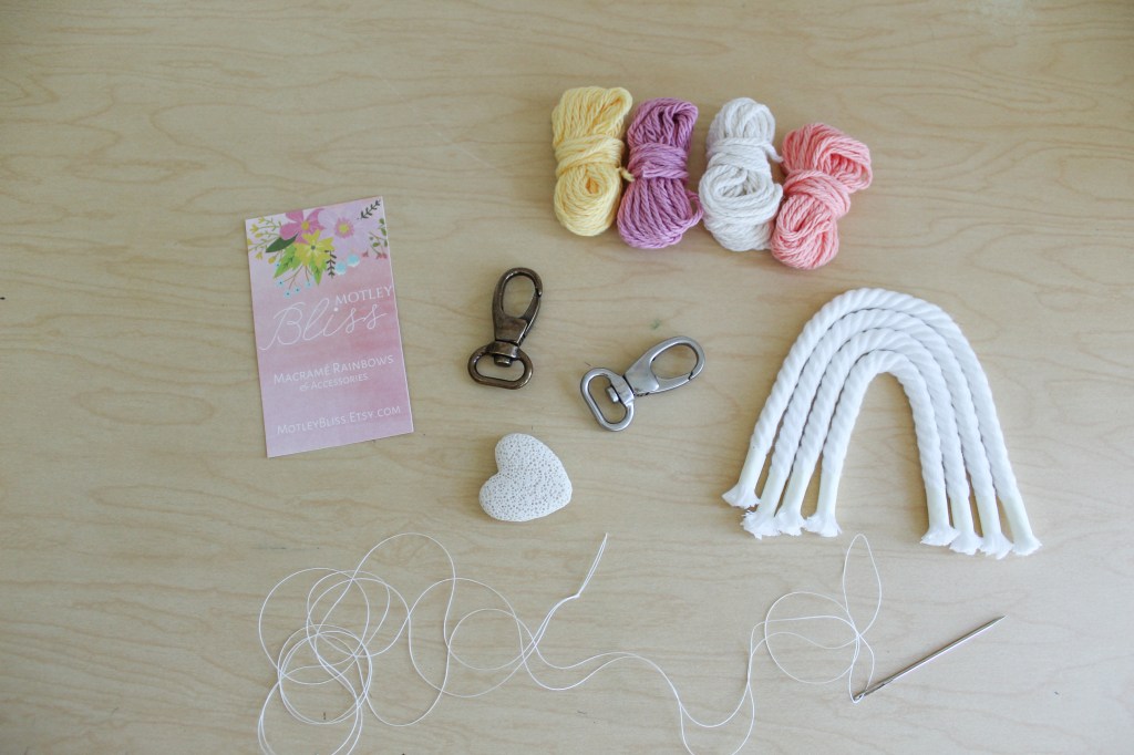 2. Set out all your supplies. When you’re ready to begin, start by setting out all your supplies. You should have either a bronze keychain, a silver keychain or diffuser (whatever you chose when you purchased your kit), your yarn, cotton rope strands cut to size, sewing needle and upholstery thread.