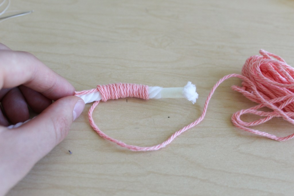 4. Scrunch the yarn together. Once you’ve been wrapping your yarn for awhile you’ll need to start scrunching the yarn together. Alternate between wrapping and scrunching until you’ve completed the piece of rope. (make sure to leave room for the fringe at the bottom)