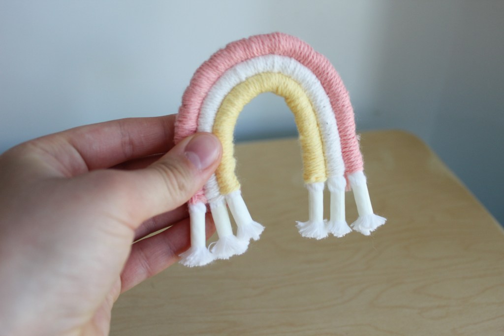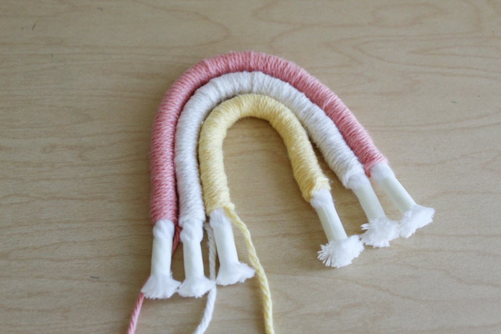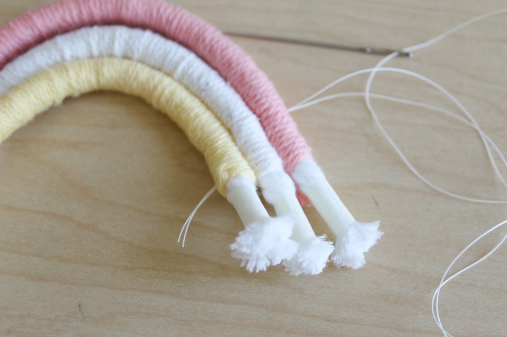 6. Sew the yarn-wrapped cotton threads together. Using your provided needle and heavy-weight thread, sew your rainbow together. It’s actually easier to do than it looks, just go back and forth, making sure to keep the rainbow shape throughout.