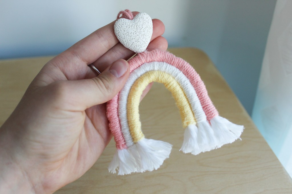 8. Thread either your keychain or diffuser onto the piece. Thread either (whichever you chose when you ordered your kit) your keychain or diffuser onto the top layer of the yarn wrapped cotton rope. And you’re done!
