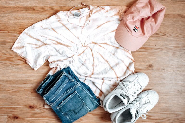 4. Try just a tie dye accessory. If you don’t want to go full out on tie dye, just try an accessory like a scrunchie, hair scarf or even a mask! This will add a fun pop of creativity and pizazz to your outfit!