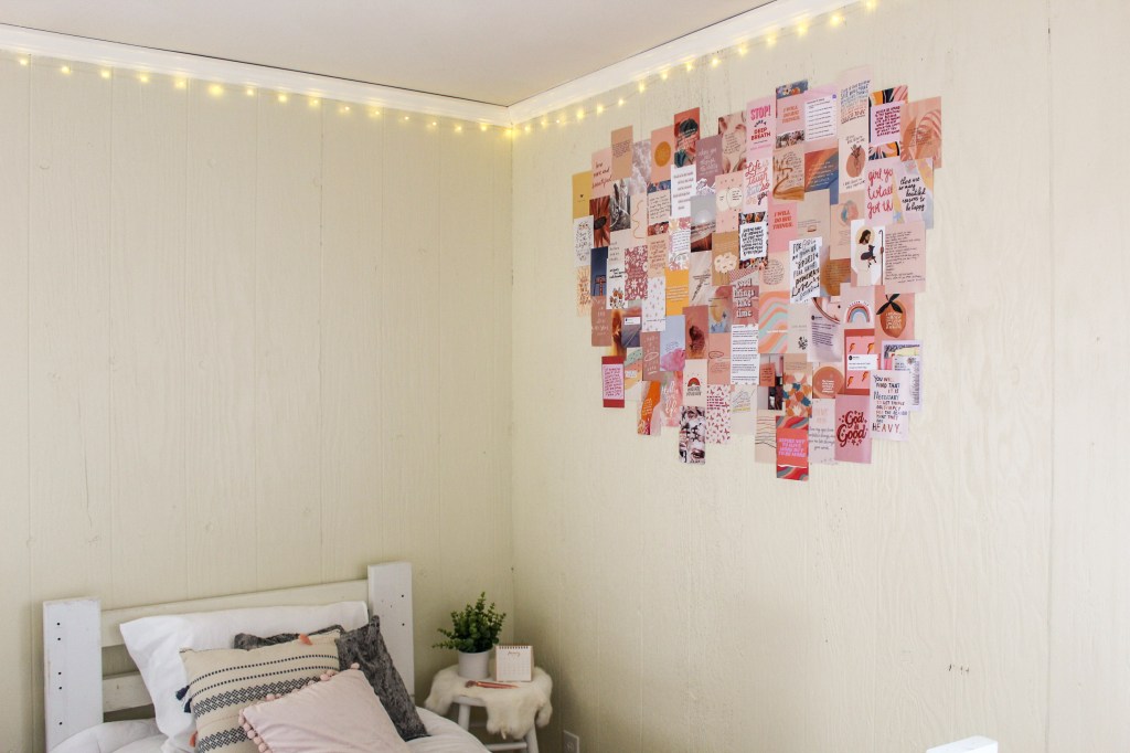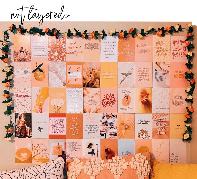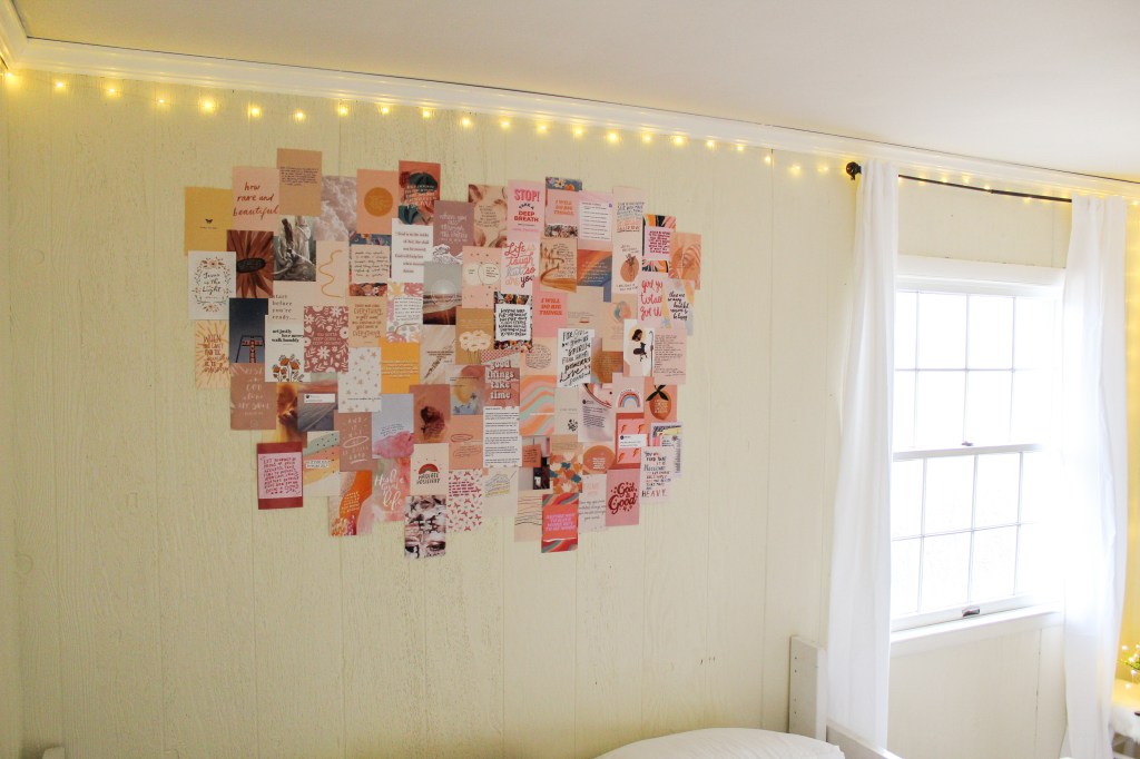 Hey friends! I’m soooo excited for today’s post (and I think you guys will be too 😉)! I’m sure you’ve all seen those lovely aesthetic collages in bedrooms & dorm rooms all over lately! I’ve been wanting to recreate one in my own bedroom for a while now and am finally getting around to doing it! There is this one bigger wall in my bedroom that was just completely blank (until now) and I love the pop of color with the rest of our more neutral décor.