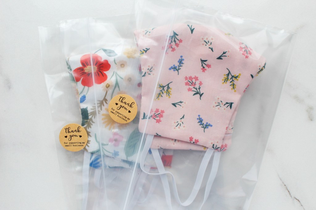 For the face masks I just slip them in the same resealable bags as the scrunchies, add in a “face mask care instructions” card and seal them up with the kraft paper (hopefully soon, pink & gold) stickers!