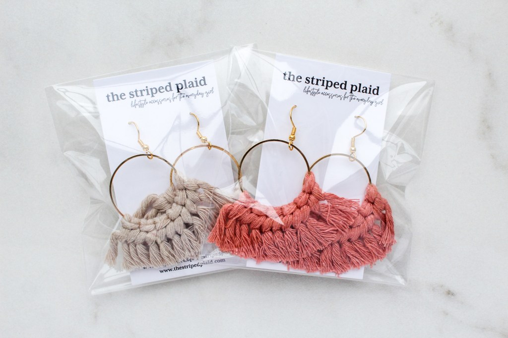 The macramΓ© earrings also are packaged similarly to the scrunchies & hair ties. The only real difference is that I poke two holes in the top of the card for the earrings so they can hang down! I love the look of the colorful earrings with gold hardware on the black and white simple card! π