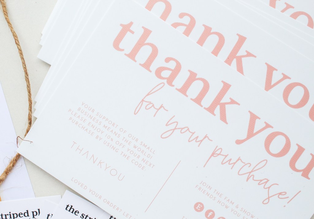 I always make sure to slip one of these cute postcards in with every order! They have a little info about my shop + ways to stay connected and also a coupon code for next time! I get these printed at Vistaprint and they’re super professional looking and inexpensive! Also, for a personalized touch I always like to add a handwritten “thank you” then sign my name. I think that my customers really appreciate that personalized touch – it makes the whole experience seem like you’re buying from a real person, not just a big brand! #shopsmall