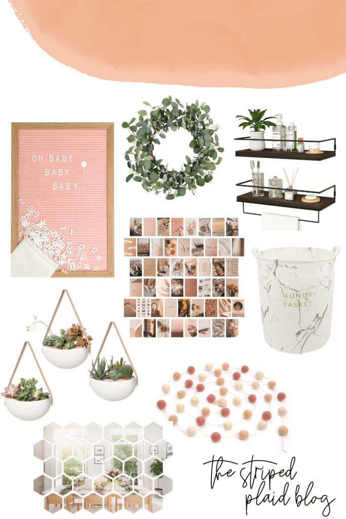 Pink Letterboard $28.97 // Eucalyptus Wreath $19.99 // Black Metal Open Shelves $24.99 // Beige Wall Collage Kit $18.99 // Marble Fabric Laundry Basket $12.99 // Set of 3 Hanging Succulent Planters $26.99 // Pastel Pompom Garland $14.73 // Hexagon Mirror Stickers $13.99 //